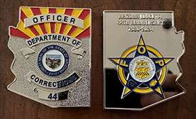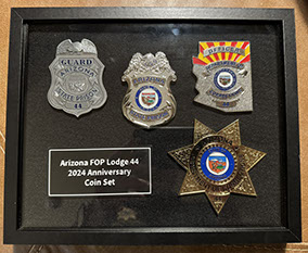 All four 44th Year Anniversary badge coins all mounted in a framed shadow box. Great for the den or office. 9 x 113/4 All proceeds go towards the Arizona Fraternal Order of Police Corrections Foundation.
