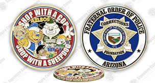 We have a very LIMITED supply of 2024 Arizona FOP Corrections Foundation SHOP-WITH-A-COP Volunteer Coins that were provided to Officers that volunteered in the program event with the Children. 1.5" Gold Plated.All proceeds go towards the Arizona Fraternal Order of Police Corrections Foundation.